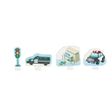 Ta edinstvena sestavljanka ponuja vašim otrokom možnost, da zgradijo svoje lastno policijsko mesto. 38 puzzlov omogoča ustvariti lastno mrežo vijugastih ulic, po katerih se lahko vozijo s policijskimi vozili in skrbijo za red. Komplet vsebuje tudi posebne elemente, ki jih je mogoče prosto razporediti na podstavkih ter tako ustvarjati nove infrastrukturne prvine.