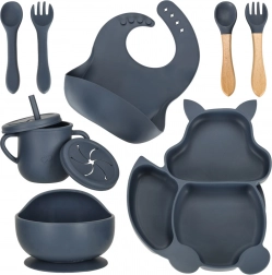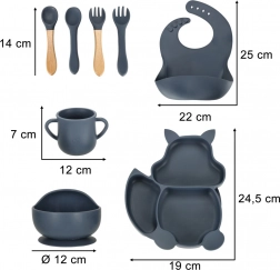 Krožnik s tremi predelki pomaga ločiti porcije in jih pregledno ohraniti na mestu. Krožnik in skledica imata prisesek, ki ju trdno drži na mizi. Lonček 2v1 ponuja pokrovček s slamico za pijače ter pokrovček za prigrizke. Silikonski slinček z globokim žepom ujame drobtine, zato je po obroku manj pospravljanja. Vse lahko preprosto perete v pomivalnem stroju.