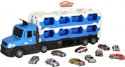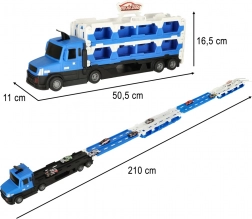 Tovornjak ponuja dvojni odmerek zabave: kot avtovleka pripelje avtomobilčke na kraj dirke, z enim gibom pa se spremeni v dirkalno stezo dolžine 210 cm. Vgrajeni izstreljevalnik pošlje vozila na stezo z bliskovito hitrostjo, medtem ko svetlobni in zvočni učinki dirkam dodajo realistično vzdušje. Trpežna plastična izvedba je idealna za vsakodnevno igro.