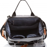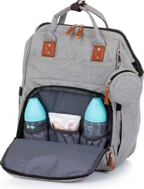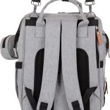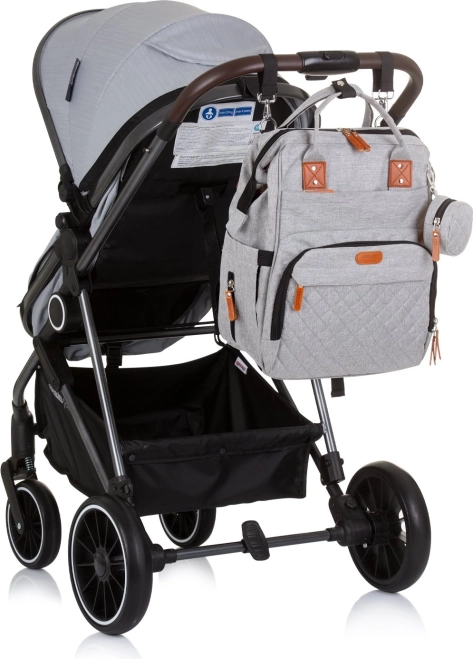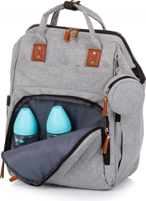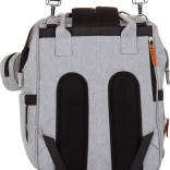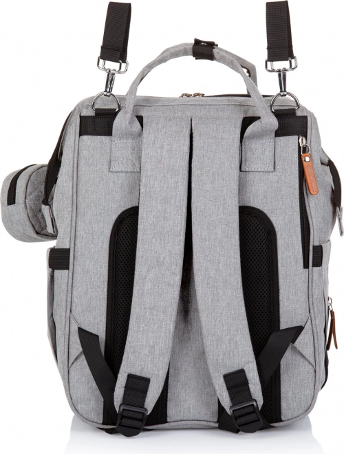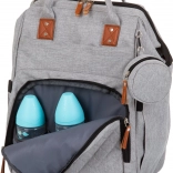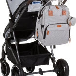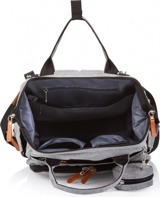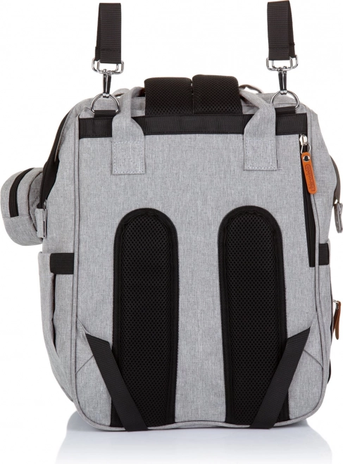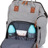 Stilski previjalni nahrbtnik v sivi barvi združuje moderen dizajn in maksimalno funkcionalnost. Zahvaljujoč številnim žepom, vključno s tremi notranjimi termo žepi za stekleničke, boste hitro našli vse pomembno – od plenic do malice. Nahrbtnik preprosto pritrdite na ročaj vozička, z oblazinjenimi naramnicami pa je udoben tudi za nošenje na hrbtu.