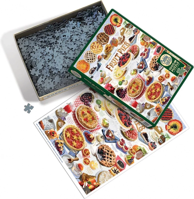 Premium sestavljanka COBBLE HILL z motivom čas za pito ponuja 1000 koščkov z nepravilnim izrezom za višjo zahtevnost in daljšo zabavo. Priložena je plakatna predloga 31,6 × 22,9 cm; sestavljena slika meri 48,9 × 67,6 cm.