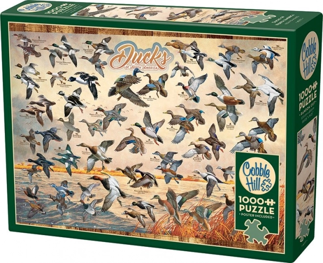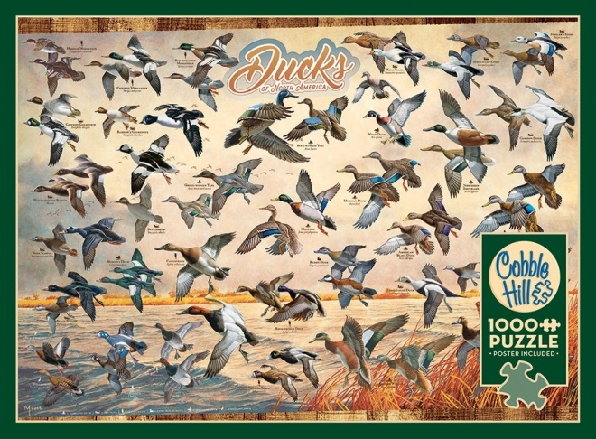 Uživajte v podrobnih ilustracijah rac Severne Amerike na kakovostni sestavljanki COBBLE HILL. Poseben nekrižni izsek z netradicionalnimi oblikami poveča zahtevnost in prinaša svežo izkušnjo v primerjavi z običajnimi »mrežnimi« izseki. Idealno za ljubitelje narave, ornitologije in izzivov.