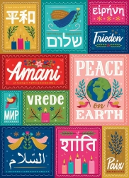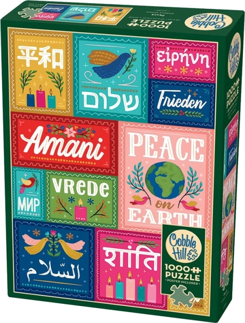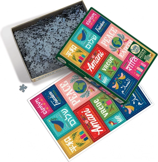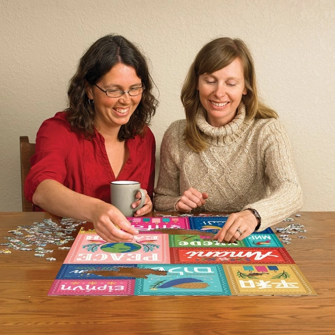 To dizajnersko puzzle prinaša močno sporočilo – mir je univerzalen. Zgornja vrstica predstavlja japonščino, hebrejščino, grščino in nemščino, na sredini najdete svahili (rdeča), ruščino, ukrajinščino in druge slovanske jezike, ki uporabljajo cirilico (turkizna), afrikaanščino, nizozemščino (zelena) in angleščino. Spodnja vrstica dopolnjuje arabščino, hindijščino in francoščino.