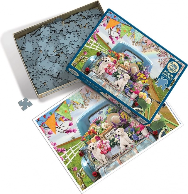 Sestavljanka prikazuje živahno podeželsko sceno z modrim starinskim kombijem, cvetjem in kužki.
