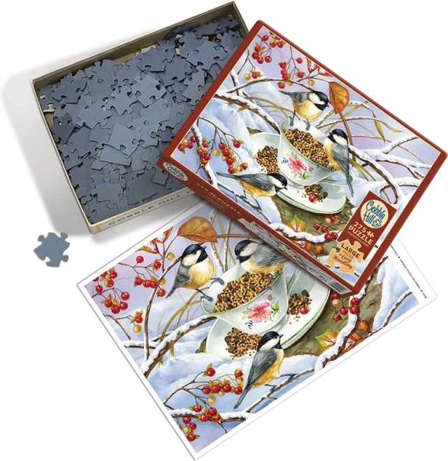 Odkrijte zimski motiv s pticami ob skodelici čaja, ki polepša vsako mizo in dnevno sobo. Ta sestavljanka s 275 XL kosi daje poudarek na udobju, hkrati pa nudi dodelan izziv zahvaljujoč izvirni štanci COBBLE HILL. Kosi niso razporejeni v klasično mrežo, zato je sestavljanje zabavno, raznoliko in vedno presenetljivo.