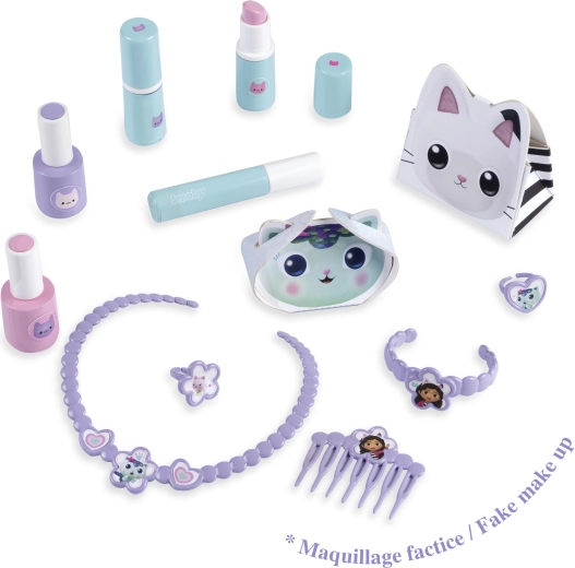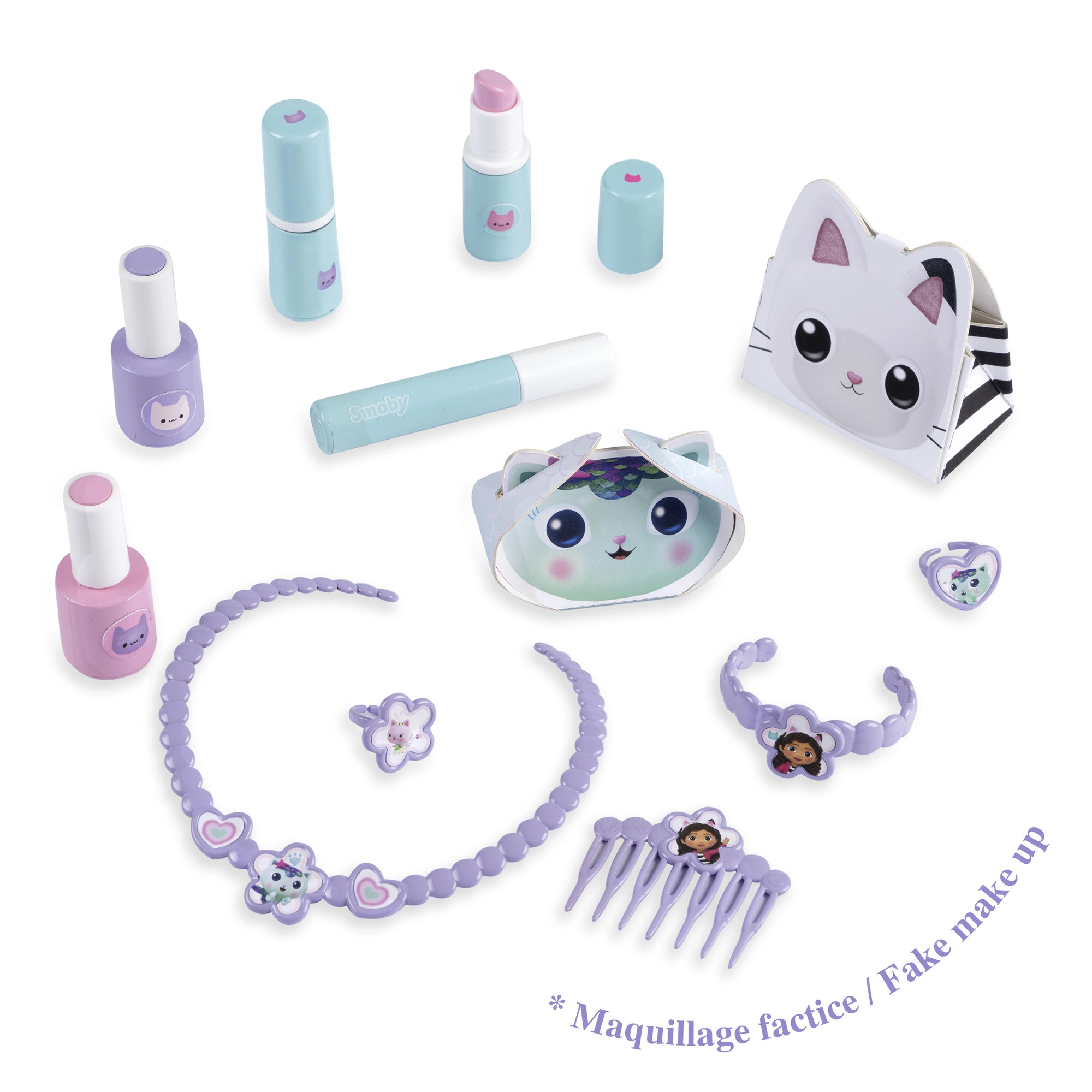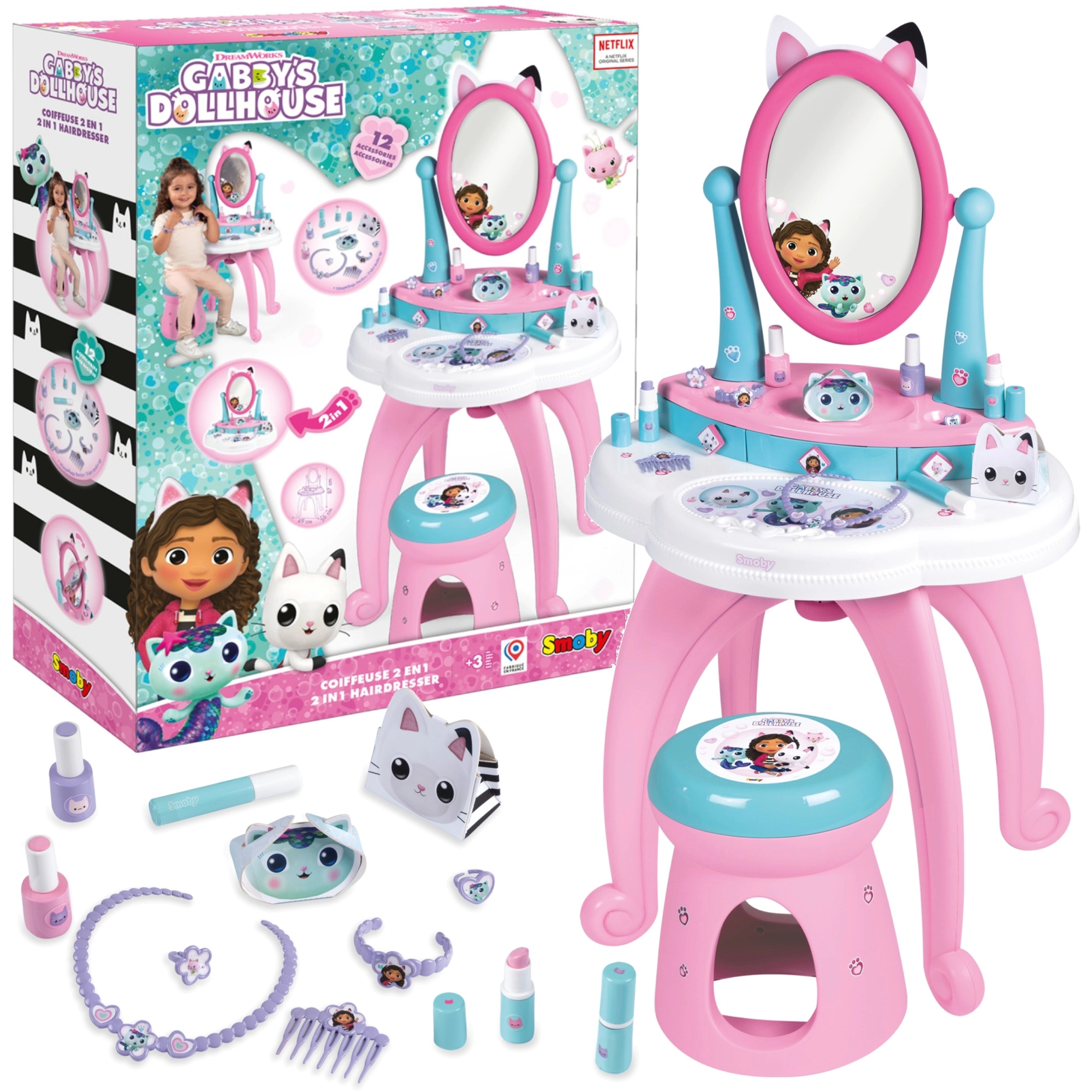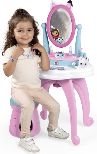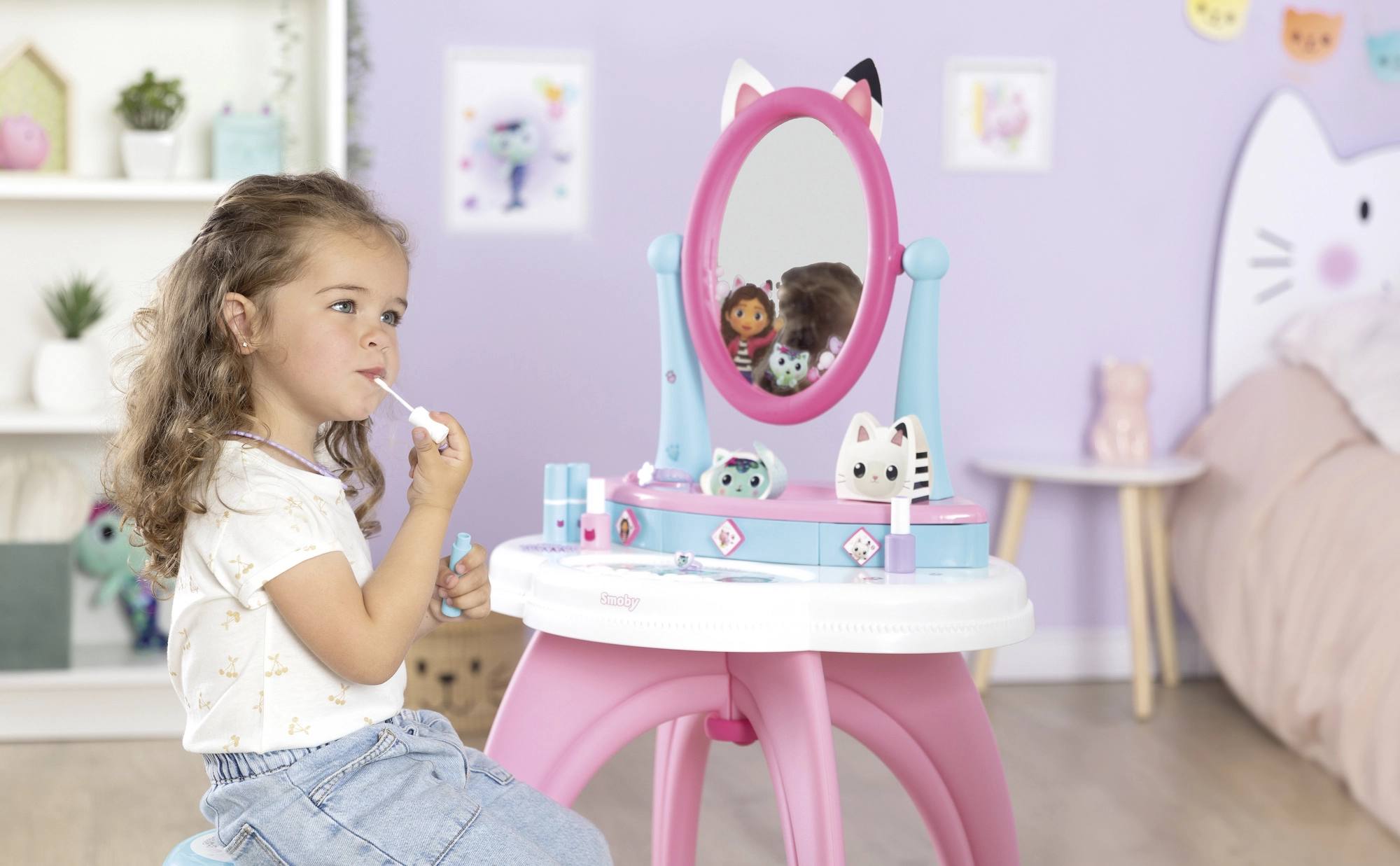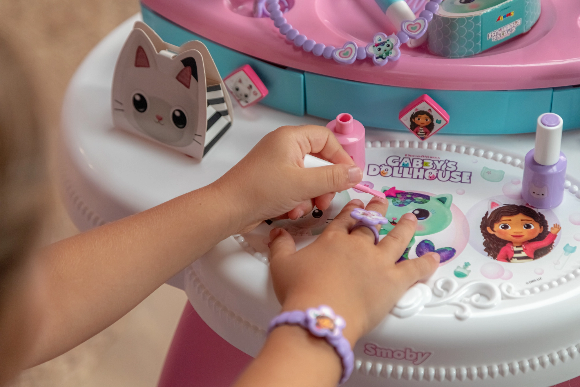 Toaletna mizica za otroke, navdihnjena s priljubljeno serijo GABBY’S DOLLHOUSE, spremeni sobo v mali kozmetični studio. Zahvaljujoč velikemu nastavljivemu ogledalu, trem predalom in bogatemu naboru dodatkov je vse pri roki, igra pa deluje realistično in varno.
