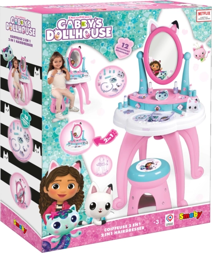 Vstopite v čarobni svet GABBY’S DOLLHOUSE z otroško toaletno mizico 3 v 1 znamke Smoby. Ponuja sušenje las, ličenje in nego nohtov, ima veliko nastavljivo ogledalo, 3 predale in udoben stolček. V paketu je 12 dodatkov za ustvarjalno igro in razvoj domišljije.