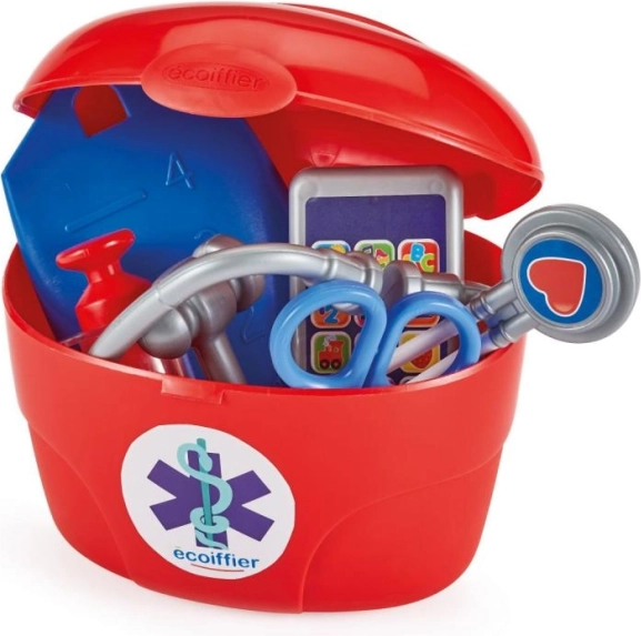 V kompletu je rdeč zdravniški kovček, v katerega lahko otroci shranijo vse pripomočke. Vse ostane skupaj in pripravljeno za naslednjo igro.