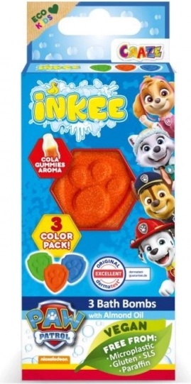 Šumeče kroglice Inkee Paw Patrol spremenijo kopel v barvito in dišečo igro. Vsaka mini kroglica postopoma šumi, obarva vodo in sprosti nežen vonj, ki ga bodo otroci vzljubili. Zahvaljujoč dodanemu mandljevemu olju pomagajo kožo zmehčati in narediti bolj gladko.
