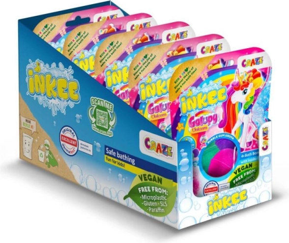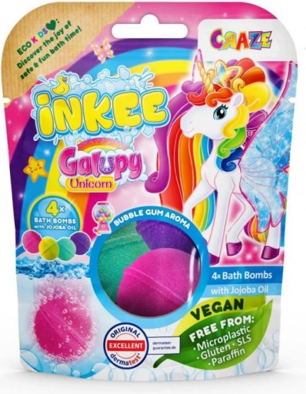 Vnesite veselje in barve v otroško kopel z INKEE Galupy Unicorn. Vsaka bomba v vodi nežno šumi, sprošča zabavne barve in sladek vonj žvečilnega gumija, medtem ko jojobino olje pomaga ohranjati kožo mehko.