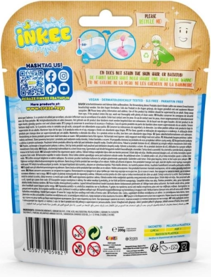 Izdelki INKEE so zasnovani z mislijo na otroke in naravo – so veganski, brez mikroplastike, brez SLS, brez parafina in primerni za otroke od 3. leta dalje. Pakirano v priročni vrečki z okencem za lažjo izbiro barve.