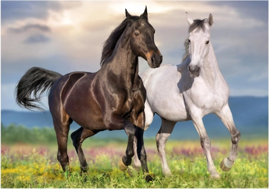 Odkrijte veselje do sestavljanja z izrazitim motivom dveh konj v galopu. Slika navduši z realističnimi detajli in živahnimi barvami, ki po dokončanju izstopajo kot dekoracija. Zaradi premišljene zahtevnosti je sestavljanka odlična tako za začetnike kot tudi za napredne.