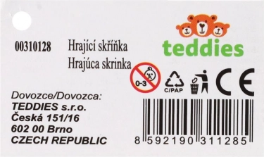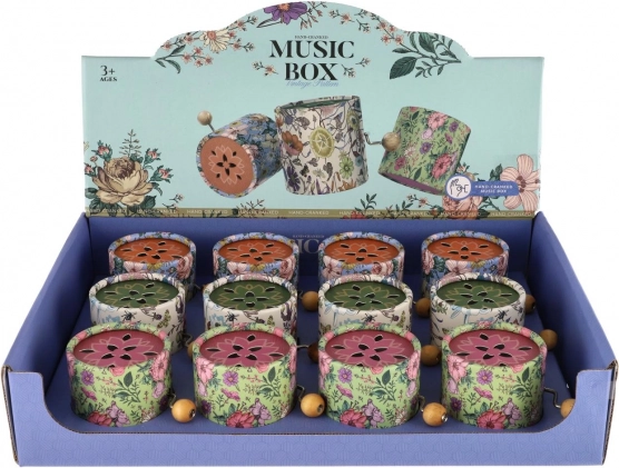 Skrinjica je na voljo v več barvnih različicah z dekorativnim cvetličnim vzorcem. Ročni mehanski pogon ne potrebuje baterij, zato je vedno pripravljena za uporabo. Priporočeno za otroke od 3 let.