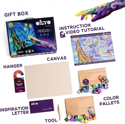 V svoj dom prinesite čar slike Zvezdna noč avtorja Vincenta van Gogha in ustvarite svoj edinstven motiv. Seta uporablja air clay (samostrdljivo maso), ki končnemu delu doda reliefni 3D učinek. Slikanje s prsti je intuitivno, zabavno in sproščujoče – primerno za otroke in odrasle.