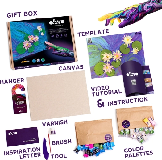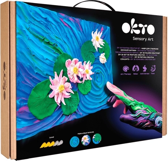 Odkrijte veselje ustvarjanja z likovnim kompletom Okto »Lokvanji« v formatu 30 × 40 cm. V paketu najdete vse potrebno za lastno umetniško delo: naravno platno, modelirne mase, akrilni lak na vodni osnovi, čopič, lesen orodje za oblikovanje in razumljiva navodila.