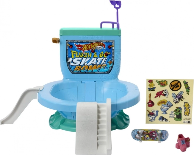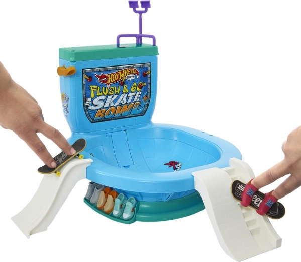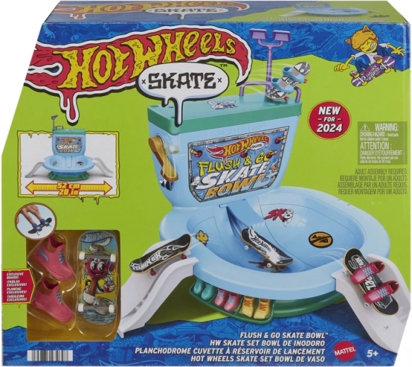 Začnite akcijo z noro zabavnim setom HOT WHEELS Skate Flush & Go – prstnim skejtparkom v obliki straniščne školjke. Pritisnite ročico in spustite prstni skejt v ogromno skledo, vozite se po rampah, navdihnjenih s toaletnim papirjem, preizkusite zadnjo rampo in ograjo. Na voljo je shranjevanje za 4 skejte in 6 parov prstnih čevljev, v pakiranju pa najdete 1 prstni skejt in 1 par snemljivih čevljev za prste.