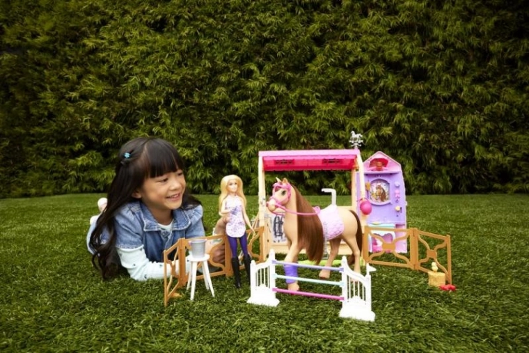 Doživite konjeniški dan z setom Barbie Ultimate Stable, ki ponuja 360° igralno okolje in obilico dodatkov za nego konja. Otroci lahko pomagajo Barbie pri hranjenju na postaji, čiščenju in krtačenju v negovalni coni, trenirajo skoke čez ovire in nato ponosno razstavijo trakove na steni s trofejami. Ne manjka niti rožnat „plug and play“ vrtiček ter možnost, da hlev preprosto zložite za lahko shranjevanje.