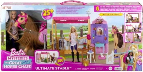 Odkrijte čar konjeniškega sveta z igračnim setom Barbie Ultimate Stable, navdihnjenim po seriji Barbie Mysteries: The Great Horse Chase. Več kot 25 delov in 6 igralnih con prinaša neskončno ustvarjalno igro – od hranjenja in nege konja do treninga skokov ter razstavljanja trofej. Konj ima dolgo grivo in rep za česanje in oblikovanje, lutka upogiba kolena za realistično jahanje, hlev pa je mogoče preprosto zložiti za shranjevanje.