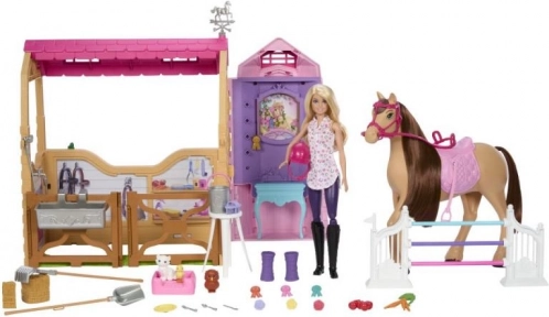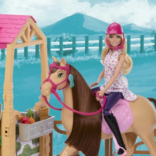 V kompletu so lutka Barbie v jahalni opravi, konj z realističnimi podrobnostmi in dolgo mehko grivo, hlev s strešico ter bogat nabor dodatkov za domišljijsko igro. Set je idealen za otroke od 3 let, ki imajo radi konje, skrb za živali in pripovedovanje lastnih zgodb.