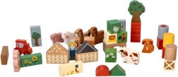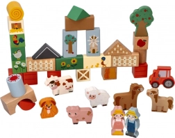 Zabavne in izobraževalne lesene kocke, ki spodbujajo otroke k ustvarjalnosti in razvoju njihovih motoričnih spretnosti na kmetiji polni barv in dogodivščin.