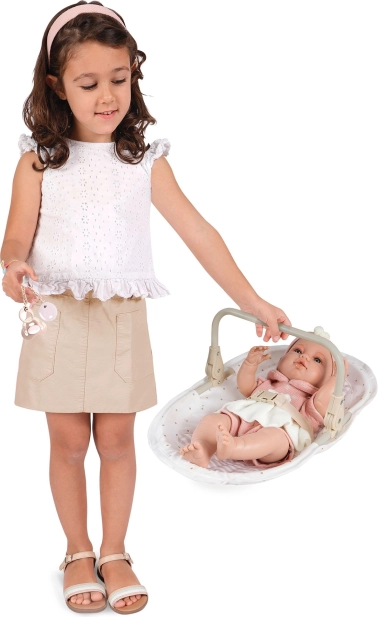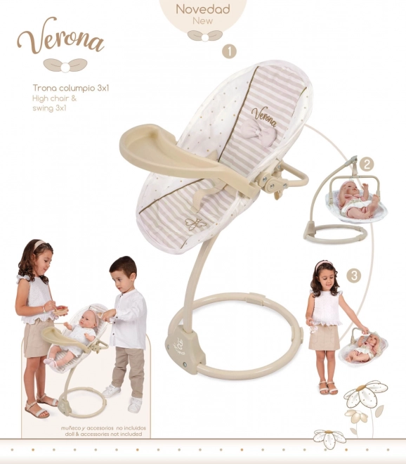 Ta večnamenski stolček in gugalnik za punčke 3 v 1 iz kolekcije Verona prinaša otrokom realistično igro in veliko možnosti za skrb za njihovo najljubšo dojenčico. Kombinacija svetlo bež in bele barve z vzorci pik in črt, dopolnjena z diskretnim obrobnim šivom in aplikacijami pentelj, ustvarja brezčasen naraven videz, navdihnjen s španskim dizajnom.