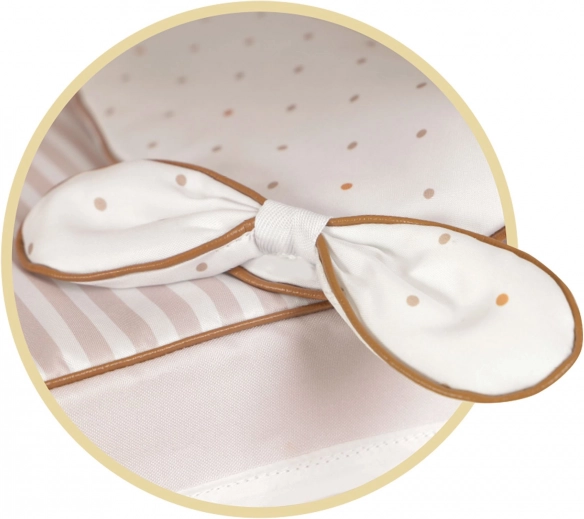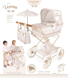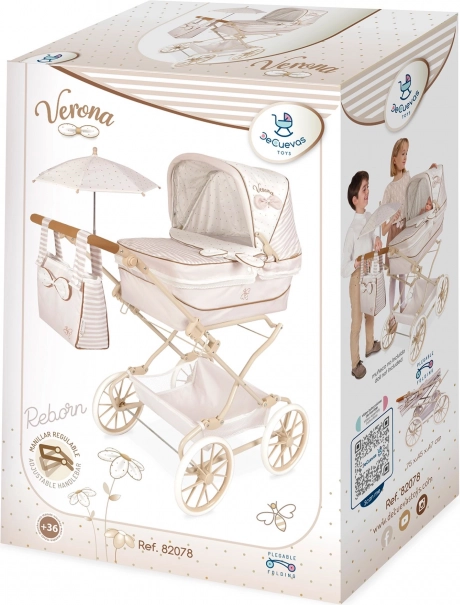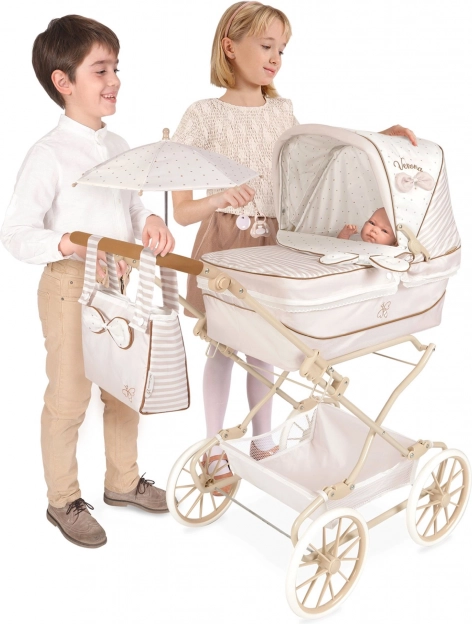 Očarljiv voziček za punčke REBORN Verona 2024 v kombinaciji svetlo bež in bele z nežnimi pikami in črtami navduši z natančno špansko izdelavo in brezčasnim dizajnom. Zahvaljujoč višinsko nastavljivemu ročaju (65–90 cm) se popolno prilagodi rasti otroka in je enostaven za upravljanje.