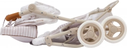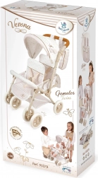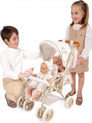 Odkrijte čar kolekcije Verona v nežnih naravnih tonih in vzorcih. Svetlo bež in bele tkanine s pikami in črtami dopolnjuje eleganten rob in detajli v obliki pentljic ter vezenih čebelic. Voziček za dvojčke je zasnovan za udobno vožnjo dveh punčk hkrati in navdušuje z natančno izdelavo ter španskim dizajnom.