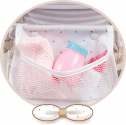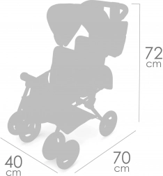 Z nastavljivimi naslonjali, vrtljivimi sprednjimi kolesi in nastavljivim ročajem 41–72 cm je upravljanje enostavno tudi za mlajše otroke. Mrežast zadnji žep in spodnja košara ponujata dovolj prostora za drobnarije, medtem ko 3-točkovni pasovi punčke varno držijo na mestu. Zložljiva konstrukcija olajša prenašanje in shranjevanje doma.