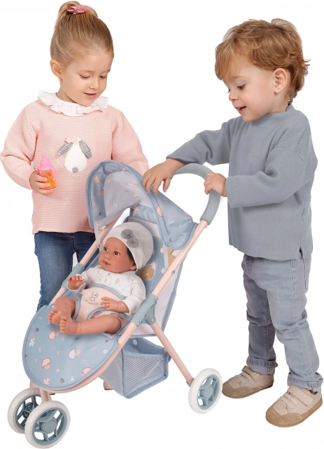 Vrtljivo sprednje dvojno kolo olajša zavijanje, spodnja košara nudi praktičen prostor za shranjevanje, tritočkovni pas pa varno pritrdi punčko do velikosti 46 cm. Kompaktne mere 55 × 48 × 33 cm (v × g × š) omogočajo enostaven prenos in shranjevanje.
