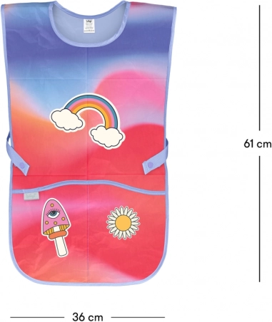 Praktične podrobnosti, kot sta dva prostorna žepa, nastavljiv vratni trak in vezanje v pasu, zagotavljajo udobno nošenje. Obrisljiv material se po vsakem ustvarjalnem podvigu z barvami ali testom zlahka očisti.