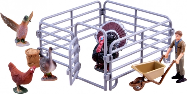Ročno barvan kmečki set: puran, petelin, gos, raca, kmet in ograda. Trpežne figurice za kreativno igro in učenje o življenju na podeželju.