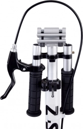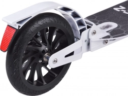 Za vašo varnost skrbi kombinacija ročne kolutne zavore in zadnje trenjske zavore, integrirane v blatniku z odsevnikom. Sprednje vzmetenje ublaži neravnine, zato je vožnja tekoča in udobna tudi na grobejši podlagi. Velika PU kolesa s premerom 200 mm vozijo hitro in gladko ter hkrati ponujajo odlično stabilnost.