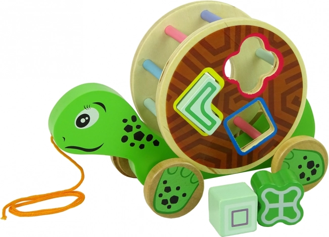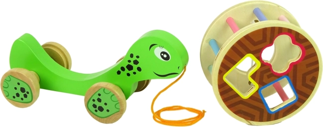 Lesena vlečna želva s sortirnikom je pametna igrača za najmlajše, ki združuje gibanje, razvoj fine motorike in učenje oblik. Barvni vrtljiv boben s sortirnikom in 3 kockami uri logiko ter koordinacijo oko–roka, medtem ko vrvica in kolesca spodbujajo k aktivni igri. Izdelano iz kakovostnega lesa in varno lakirano.