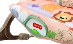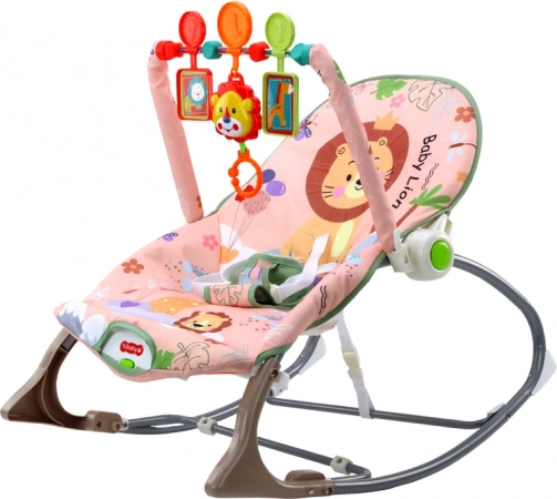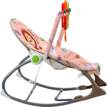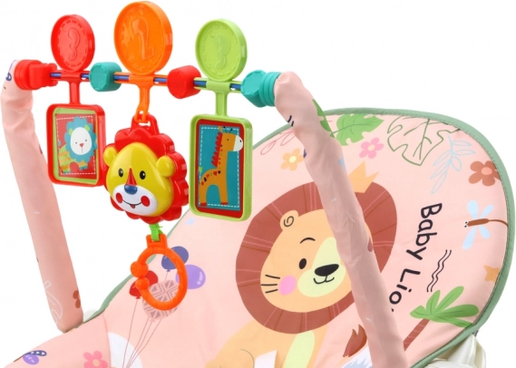 Zibelka je zasnovana s prijetnim rožnatim tekstilnim pregrinjalom, ki ga krasi motiv prisrčnega leva in barvitih cvetlic. Del zibelke je barvita igrača na loku, ki vključuje viseče živali, kot sta lev in žirafa, ter spodbuja otrokovo interakcijo.