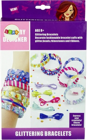 V paketu najdete: 4 prozorne zapestnice, 3 bleščice (zlata, srebrna, rožnata) in trakove v različnih barvah. Komplet je shranjen v okrasni škatli, zato je odličen kot darilo. Priporočeno za otroke od 8 let. Vsebuje majhne delce.