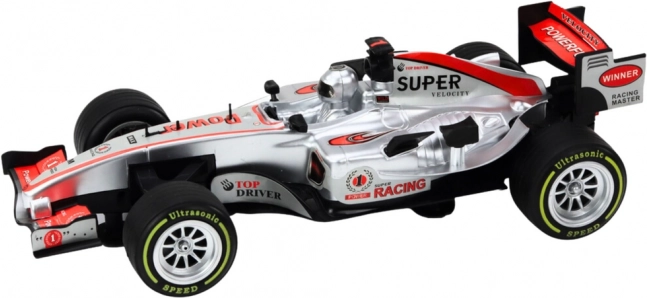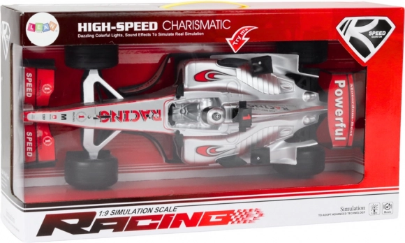 Slogovni dirkalni avto v srebrni barvi v merilu 1:9 bo navdušil male in velike ljubitelje avtomobilov. Ponuja realističen videz, svetlobne in zvočne učinke ter mehanizem na navijanje za dinamično vožnjo. Velika črna dirkalna kolesa zagotavljajo dobro oprijemljivost na različnih podlagah, športni spojlerji pa vozilu dodajo agresiven videz.