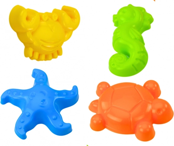 Vsebuje modelčke v obliki rakovice, morskega konjička, morske zvezde in želve za kreativno ustvarjanje v pesku.