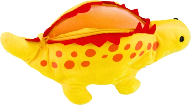 Predstavljamo plišastega dinozavra, ki bo očaral vsakega otroka s svojo živahno rumeno barvo in rdečimi detajli. Izdelan je iz mehkega materiala, ki je prijeten na dotik. Ta dinozaver ni le običajna igrača – zahvaljujoč zadrgi na hrbtu lahko služi kot praktična peresnica ali shranjevalni prostor za drobnarije vaših otrok. Ima tudi obešalno zanko, kar omogoča enostavno pripenjanje na nahrbtnik ali torbo.