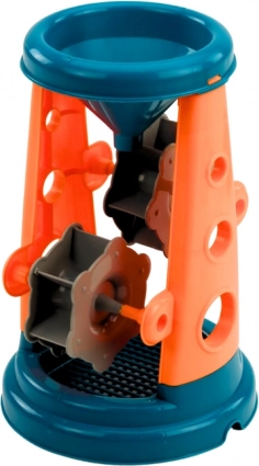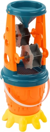 .Barvit komplet za pesek z mlinčkom je popolna oprema za male plažne mojstre ali navdušence nad igro s peskom. Glavni element kompleta je vedro z mlinčkom, ki ima na eni strani praktično sito za sejanje peska, na drugi strani pa lij, ki olajša natančno doziranje peska pri gradnji. Zahvaljujoč tej praktični rešitvi je igra učinkovitejša in bolj ustvarjalna.