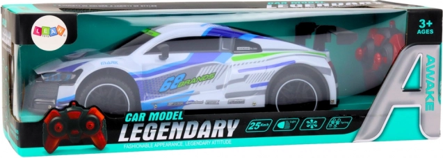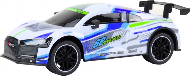 Doživite adrenalin z daljinsko vodenim modelom v merilu 1:10, ki doseže do 25 km/h. Elegantna bela izvedba z modro‑zelenimi poudarki, LED luči za vožnjo tudi po temi, 2.4G daljinsko upravljanje za stabilen doseg in hiter odziv, gumijaste pnevmatike in blažilniki za boljši oprijem in nadzor – idealno za otroke in odrasle navdušence.