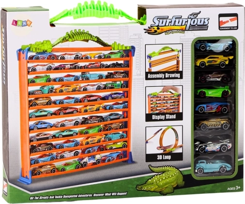 Univerzalen komplet za male ljubitelje avtomobilov: iz ene sestavitve ustvarite dirkalno stezo z zanko 360° in večnivojsko garažno parkirišče. Enostavno sestavljanje, stabilen ročaj za prenašanje in 8 različnih avtomobilčkov za takojšnjo zabavo. Barvna izvedba v oranžni, zeleni in modri privablja pozornost ter spodbuja ustvarjalno igro.