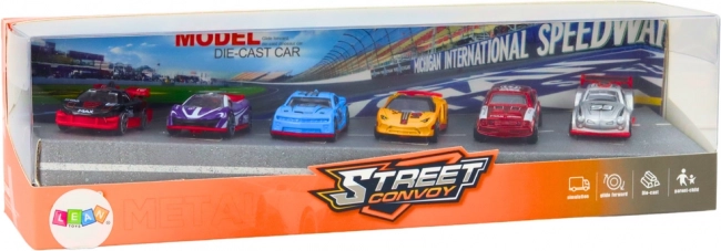 Odkrijte zabavo na dirkališču s kompletom 6 kovinskih športnih avtomobilčkov v merilu 1:64. Trpežna izdelava, različne barve in izvirne grafike spodbujajo domišljijo, medtem ko privlačno pakiranje z motivom ceste vabi k neskončni ustvarjalni igri. Primerno za otroke od 3 let, s certifikatom CE in standardom EN71.