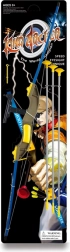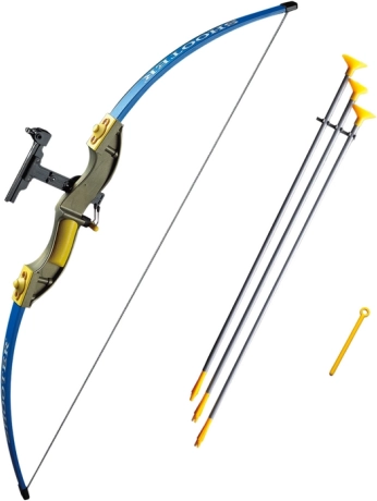 Komplet vsebuje impresiven lok, ki meri 102 cm v dolžino in je izdelan v privlačnih modrih barvah z rumenimi in zlatimi dodatki. Tri puščice v sivo-rumeni barvni kombinaciji so zaključene z gumijastim priseskom, kar zagotavlja varno uporabo in zmanjšuje tveganje poškodb.