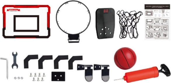 tabla, koš (obroč), mreža, košarkarska žoga, tlačilka, števec rezultata, obešala/vijaki, originalna embalaža