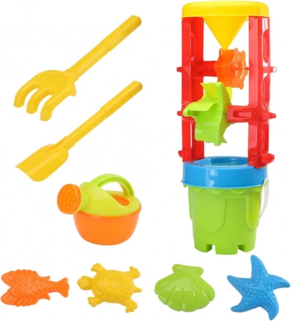 - Velik mlinček za pesek, vedro, lopatka, grabljice, kannica, 4 modelčki
