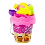 Rožnato vedro s slaščičnim motivom ima na pokrovu praktično sito, ki pomaga ločiti vodo od peska in ustvariti stabilne gradnje ter oblike.