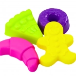Štirje izrazito barviti modelčki v oblikah, kot so krof, medenjak in rogljiček, spremenijo peskovnik v pekarno polno domišljije.