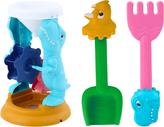 Ta barvit dino komplet za pesek spremeni vsak popoldan na plaži ali v peskovniku v pravo pustolovščino. Otroci bodo vzljubili mlinček z motivom dinozavrov, skozi katerega lahko presejejo pesek ali prelivajo vodo in opazujejo vrtenje lopatic. Modelčki pomagajo ustvarjati izvirne gradnje in dino odtise, hkrati pa razvijajo fino motoriko in domišljijo.