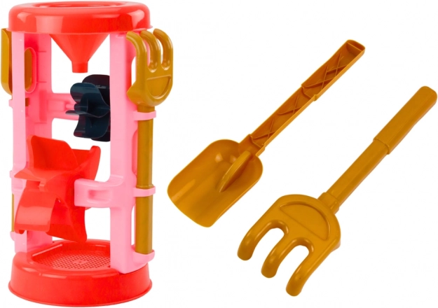 Odkrijte celovit komplet za pesek z izrazitim rožnatim mlinčkom, ki vsak peskovnik spremeni v ustvarjalno delavnico. Otroci lahko presejejo pesek skozi sito, ga sipajo skozi lijak in opazujejo, kako se zavrtijo barvna kolesca. Priloženi modelčki gradov, zalivalka, lopatka in grabljice spodbujajo domiselno gradnjo in neskončno igro.