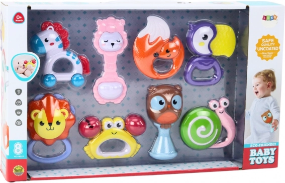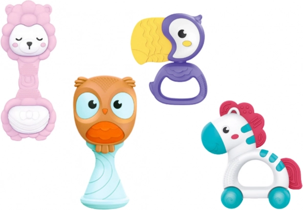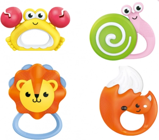 Ta vsestranski set ropotuljic in grizal v podobi ljubkih živalic prebuja otroško radovednost ter pomaga razvijati vid, sluh in fino motoriko. Žive barve pritegnejo pozornost, ropotajoči elementi krepijo slušno zaznavo, mehki grizni deli pa prinašajo olajšanje dlesnim ob rasti zobkov.
